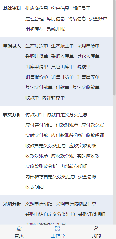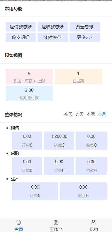 - 生产管理:生产指令 -> 派工 -> 领料申请 -> 领料出库 -> 完工入库(MRP全自动 以及 料工费一体化管理)